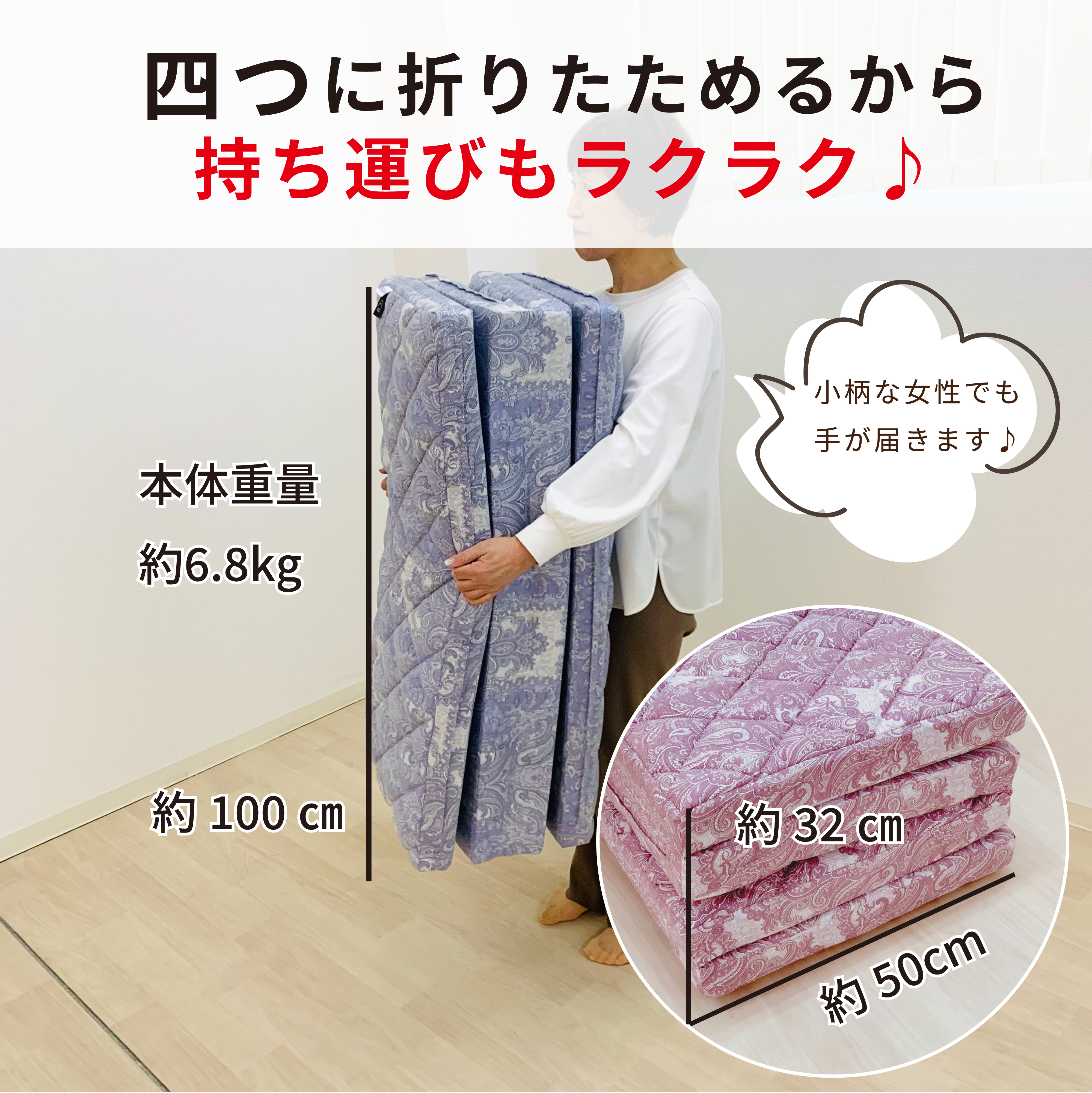 腰をしっかりサポートする四つ折り敷布団!ロイヤル2 ベリーハードは、身体をしっかり支え、理想的な寝姿勢を実現します。高密度の極厚硬質ウレタンフォームを使用しており、沈み込み過ぎず、寝返りがしやすく、耐久性にも優れています。中綿の羊毛混は、通気性が良く、湿気を逃がし、蒸れにくく、オールシーズン快適です。また、四つ折り敷きふとんは収納が簡単で、使わない時はコンパクトに保管できます。