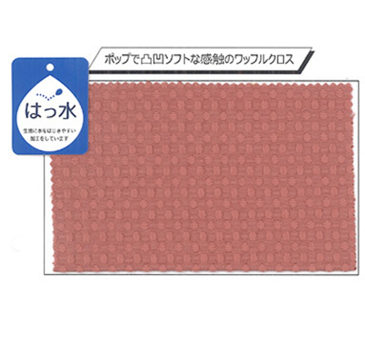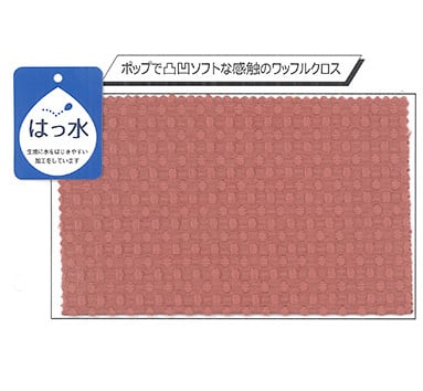 表地は、張り感とふくらみ感を併せ持ったポップな凸凹の手触りとやわらかな光沢が魅力の素材です。はっ水加工を施していますので、水をこぼしても水滴状になり拭き取れます。一般的なワッフル生地は、洗濯で縮みやすいですが、この表地の素材は 縮みが1%未満です。簡単に家庭洗濯ができ、アイロンかけも不要です。